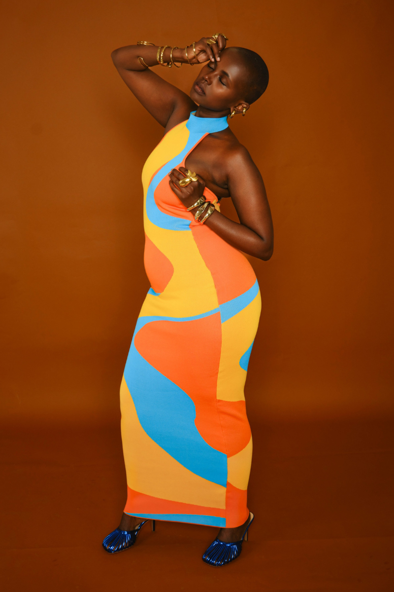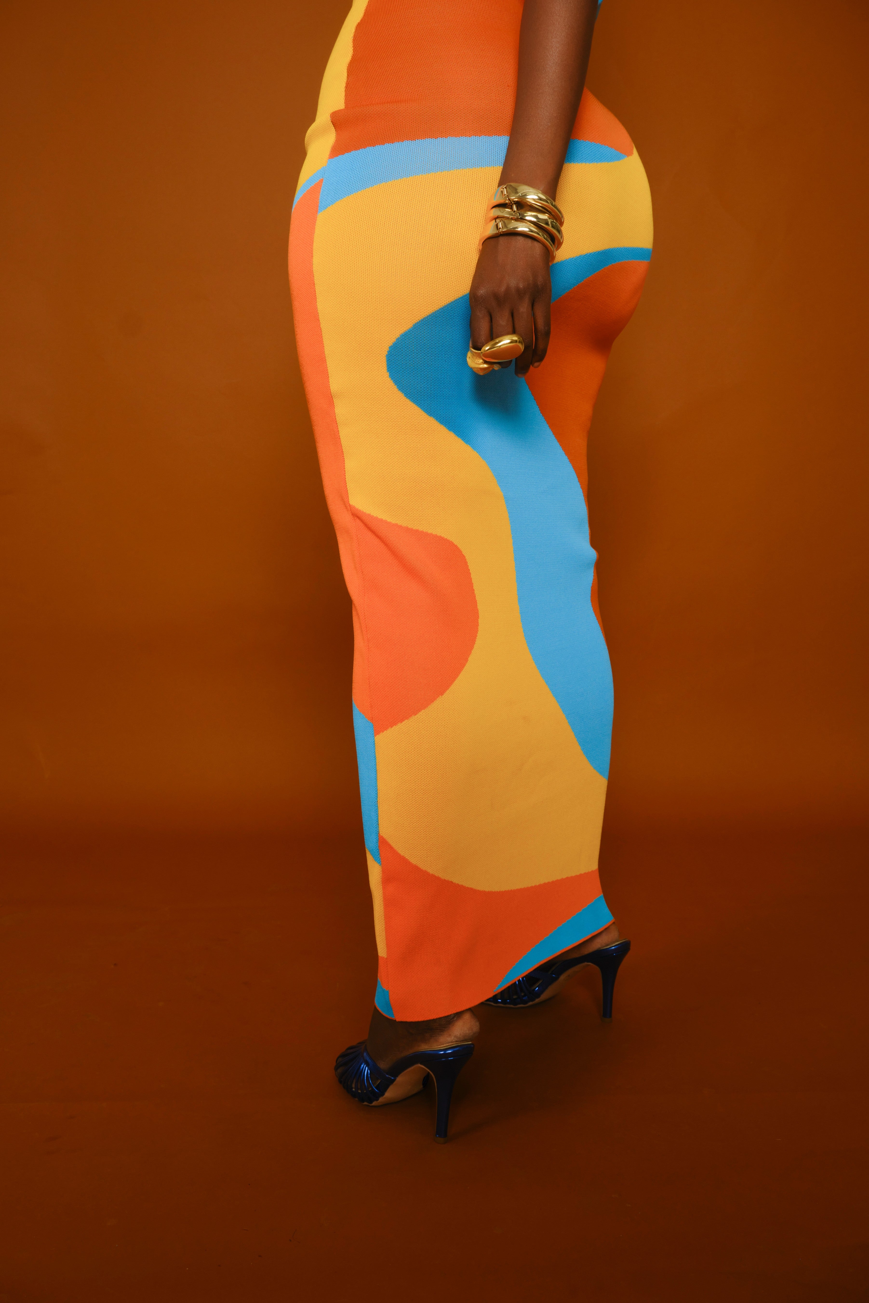 Introducing our Nowai Halter Jacquard Dress in a vibrant palette of orange, yellow, and blue hues. The halter neckline, delicately clasped with two buttons, exudes chic refinement, while the side zipper ensures a sleek, tailored fit, embracing your curves flawlessly. Embrace confident sophistication and timeless beauty in this form-fitting masterpiece, showcasing the Neiteh spirit with every elegant sway.