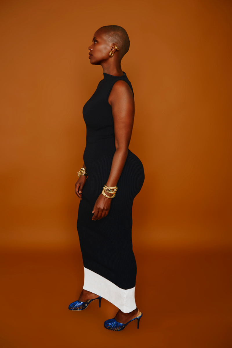 The Sauda Knit Dress in bold black with refined white detailing seamlessly blends sophistication and comfort in its form-fitting silhouette.