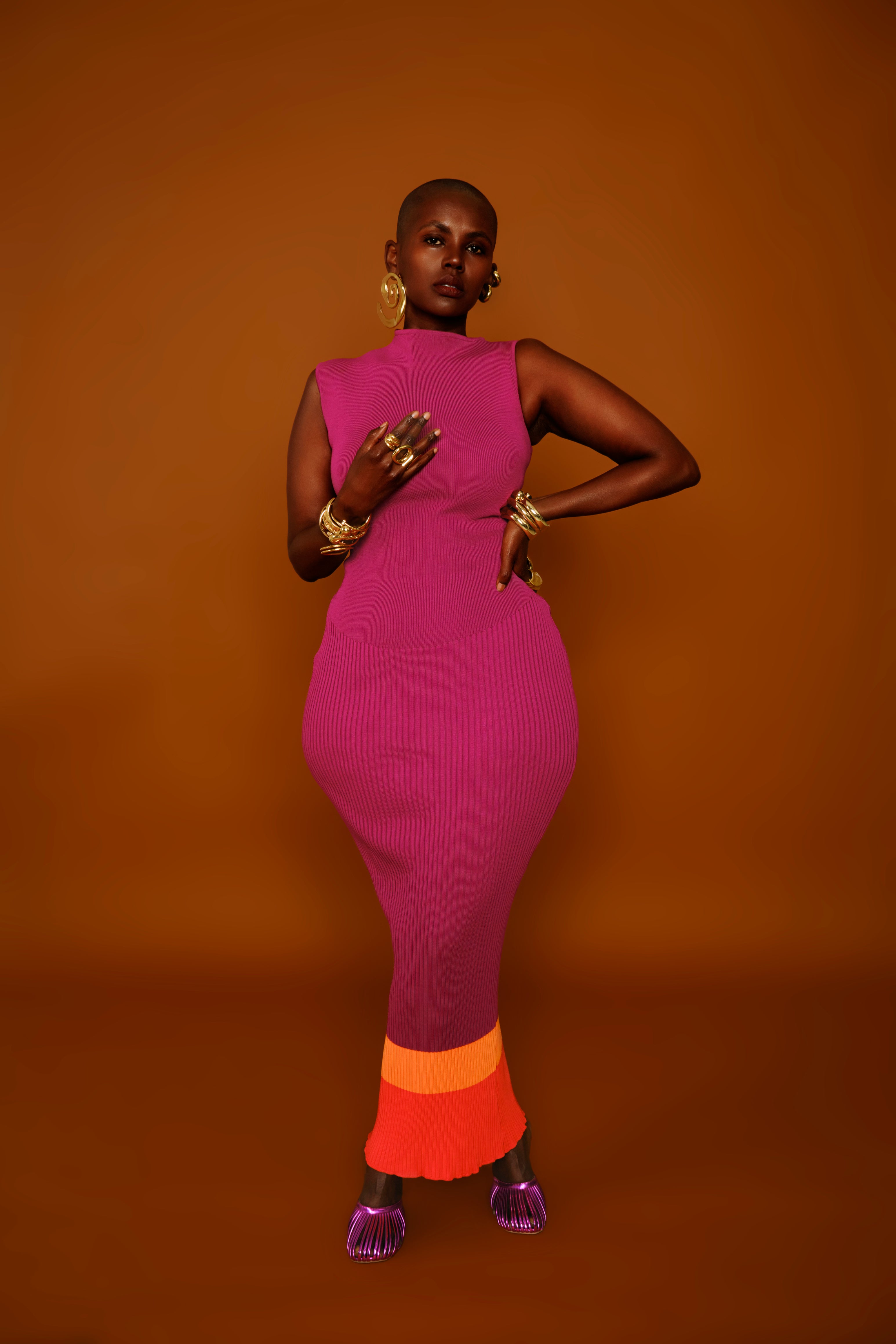 The Sauda Knit Dress combines a deep raspberry color with hints of bright orange and coral, creating a striking look reminiscent of a tropical sunset.